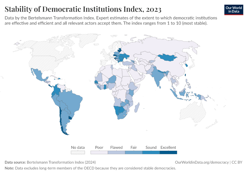 “Data Page: Stability of Democratic Institutions Index”, part of the following publication: Bastian Herre, Lucas Rodés-Guirao, and Esteban Ortiz-Ospina (2013) - “Democracy”. Data adapted from Bertelsmann Transformation Index. Retrieved from https://pop-growth-BCE.owid.pages.dev:8789/20260105-133053/grapher/stability-democratic-institutions-index-bti.html [online resource] (archived on January 5, 2026).How to cite this data