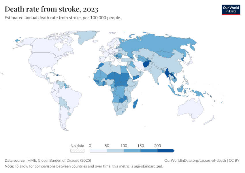 IHME, Global Burden of Disease (2024) – with minor processing by Our World in Data. “Death rate from stroke” [dataset]. IHME, Global Burden of Disease, “Global Burden of Disease - Deaths and DALYs” [original data]. Retrieved February 12, 2026 from https://pop-growth-BCE.owid.pages.dev:8789/20250909-093708/grapher/stroke-death-rates.html (archived on September 9, 2025).