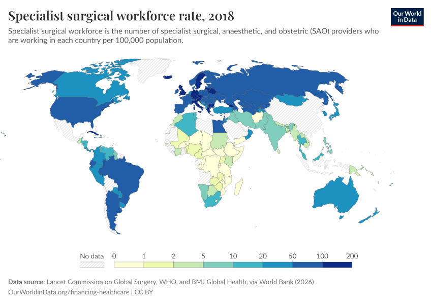 “Data Page: Specialist surgical workforce rate”. Our World in Data (2026). Data adapted from Lancet Commission on Global Surgery, WHO, and BMJ Global Health, via World Bank. Retrieved from https://pop-growth-BCE.owid.pages.dev:8789/20260112-111535/grapher/surgeons-per-100000.html [online resource] (archived on January 12, 2026).How to cite this data