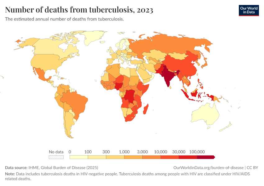 “Data Page: Number of deaths from tuberculosis”, part of the following publication: Esteban Ortiz-Ospina and Max Roser (2016) - “Global Health”. Data adapted from IHME, Global Burden of Disease. Retrieved from https://pop-growth-BCE.owid.pages.dev:8789/20250909-093708/grapher/tuberculosis-deaths.html [online resource] (archived on September 9, 2025).How to cite this data