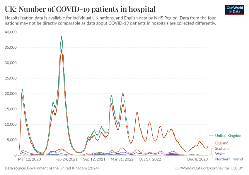 Government of the United Kingdom (2024) – with minor processing by Our World in Data. “UK: Number of COVID-19 patients in hospital” [dataset]. Government of the United Kingdom, “UKHSA data dashboard” [original data]. Retrieved February 12, 2026 from https://pop-growth-BCE.owid.pages.dev:8789/20250909-093708/grapher/uk-covid-hospital-patients.html (archived on September 9, 2025).