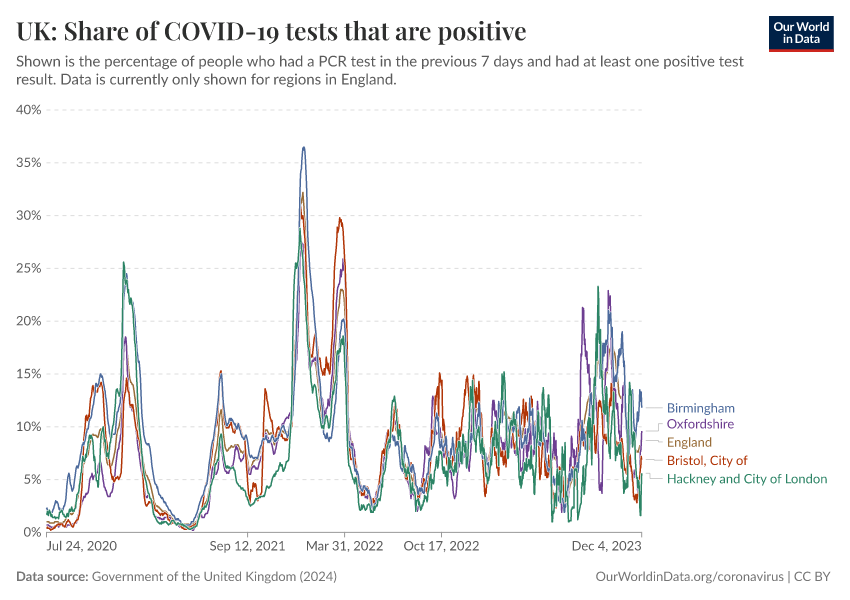 Government of the United Kingdom (2024) – with minor processing by Our World in Data. “UK: Share of COVID-19 tests that are positive” [dataset]. Government of the United Kingdom, “UKHSA data dashboard” [original data]. Retrieved February 12, 2026 from https://pop-growth-BCE.owid.pages.dev:8789/20250909-093708/grapher/uk-covid-positivity.html (archived on September 9, 2025).