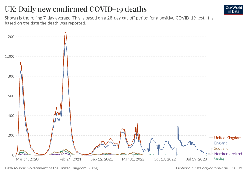 Government of the United Kingdom (2024) – with minor processing by Our World in Data. “UK: Daily new confirmed COVID-19 deaths” [dataset]. Government of the United Kingdom, “UKHSA data dashboard” [original data]. Retrieved February 12, 2026 from https://pop-growth-BCE.owid.pages.dev:8789/20250909-093708/grapher/uk-daily-covid-deaths.html (archived on September 9, 2025).