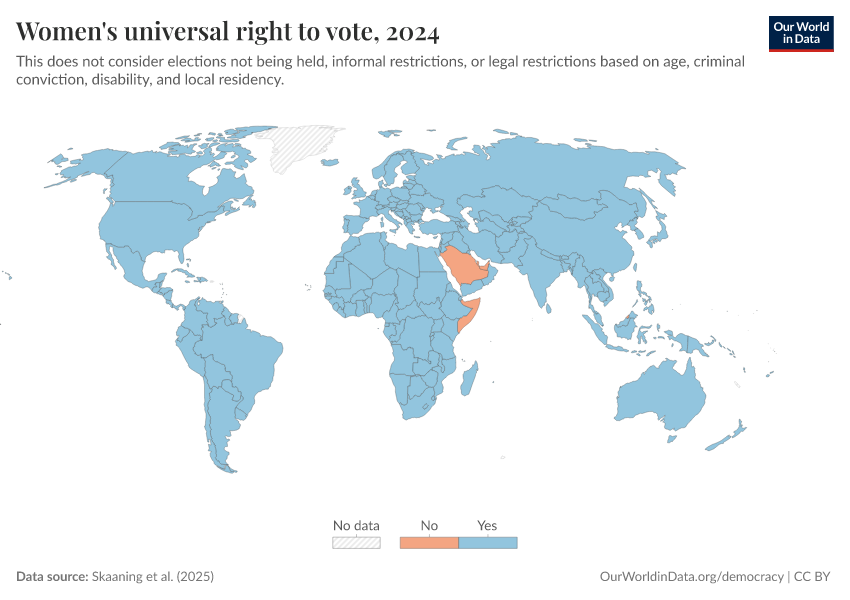 “Data Page: Women's universal right to vote”, part of the following publication: Bastian Herre, Lucas Rodés-Guirao, and Esteban Ortiz-Ospina (2013) - “Democracy”. Data adapted from Skaaning et al.. Retrieved from https://pop-growth-BCE.owid.pages.dev:8789/20260119-065148/grapher/universal-suffrage-women-lexical.html [online resource] (archived on January 19, 2026).How to cite this data