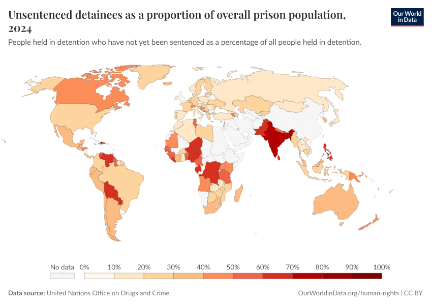 “Data Page: Unsentenced detainees as a proportion of overall prison population”. Our World in Data (2026). Data adapted from United Nations Office on Drugs and Crime. Retrieved from https://pop-growth-BCE.owid.pages.dev:8789/20260130-180113/grapher/unsentenced-detainees-as-proportion-of-prison-population.html [online resource] (archived on January 30, 2026).How to cite this data