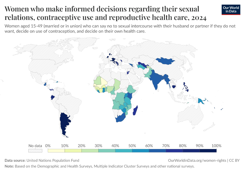 “Data Page: Women who make informed decisions regarding their sexual relations, contraceptive use and reproductive health care”. Our World in Data (2026). Data adapted from United Nations Population Fund. Retrieved from https://pop-growth-BCE.owid.pages.dev:8789/20260130-180113/grapher/women-informed-decisions-health-sexual-relations.html [online resource] (archived on January 30, 2026).How to cite this data