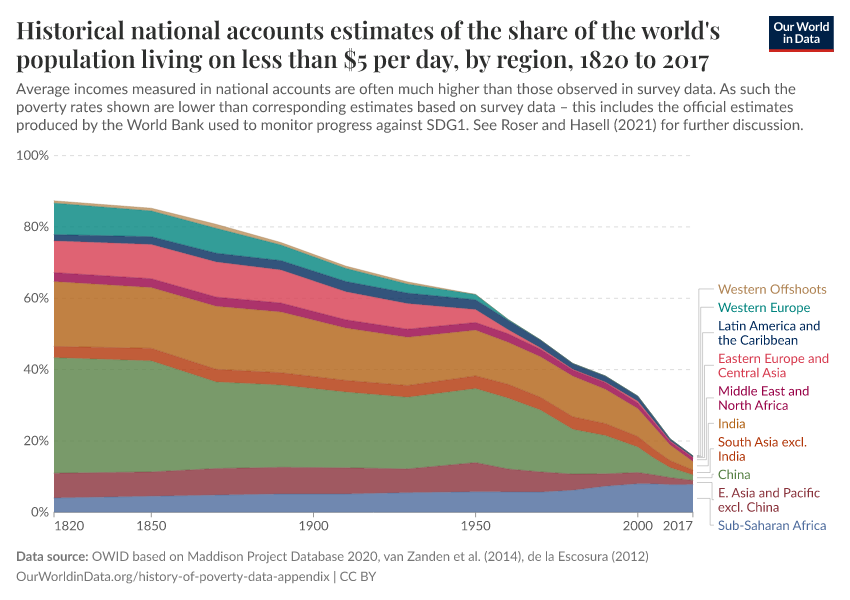 It joins recent World Bank estimates of the share of people globally living below $1.90 a day from 1980, with our own historical national accounts estimates using a poverty line of $5.20. For a discussion of these two approaches to estimating poverty and how they relate to one another see the main paper.