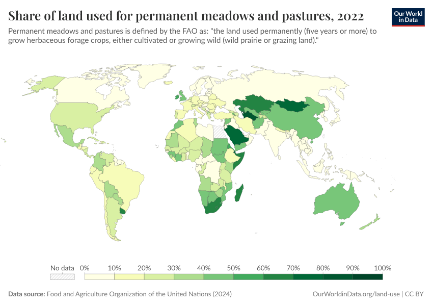 For most countries, the majority of agricultural land is used for livestock rearing in the form of pastureland. In the map here we see the share of permanent meadow and pasture as a percentage of total land area.