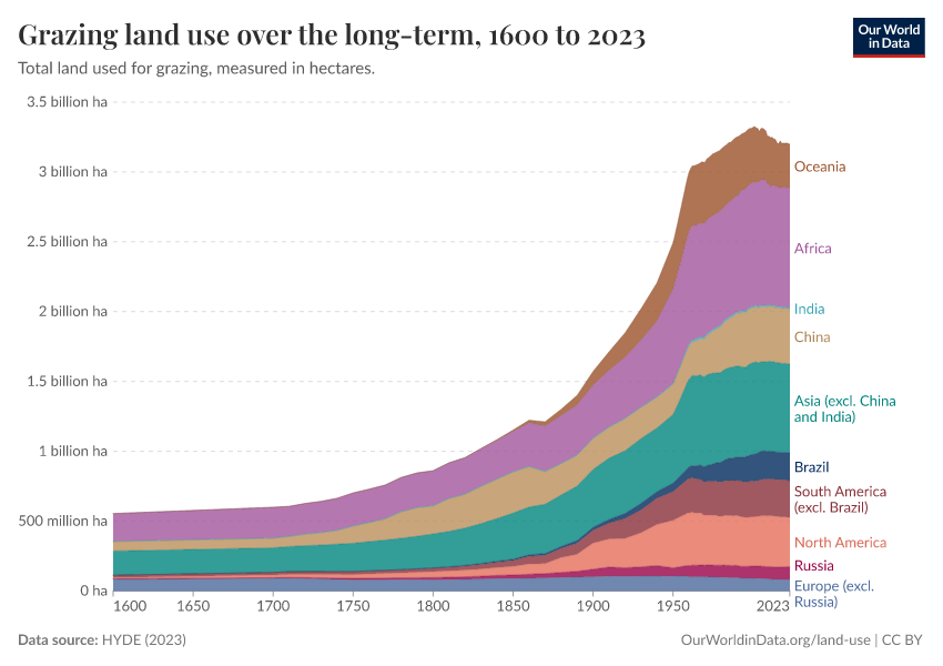 This visualization shows total cropland (which does not include land for grazing) over the long term, measured in hectares.