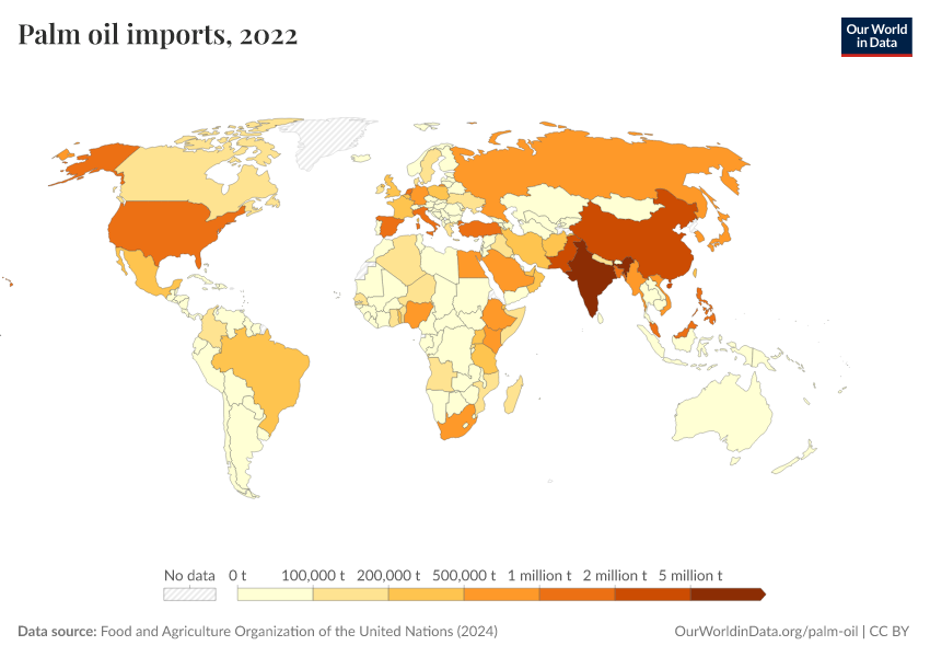 In the next section, we will look at what countries produce palm oil, but here, we see a map of palm oil imports. Although production is focused in only a few countries across the tropical belt, we see that palm oil is an important product across the world.