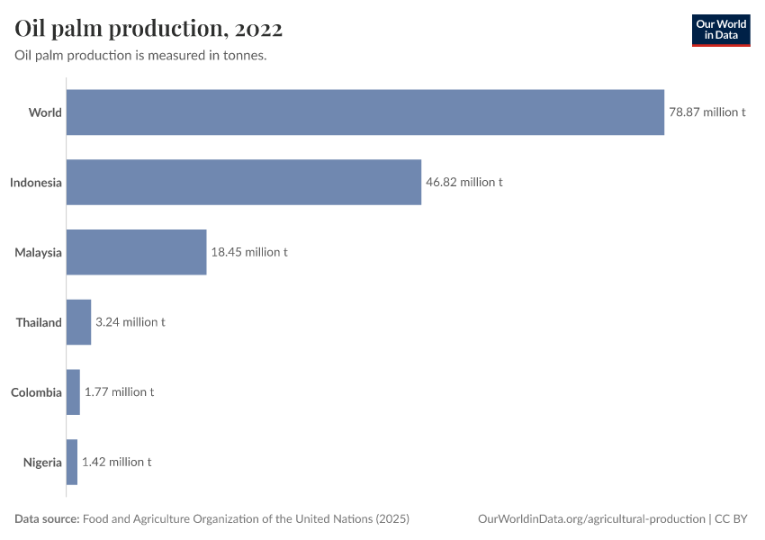 Palm oil production has increased rapidly since the 1960s. Between 1970 and 2020, the world’s production of palm oil increased by about 40 times. Global production went from only 2 million tonnes to around 80 million tonnes. The change in global production is shown in the chart.3