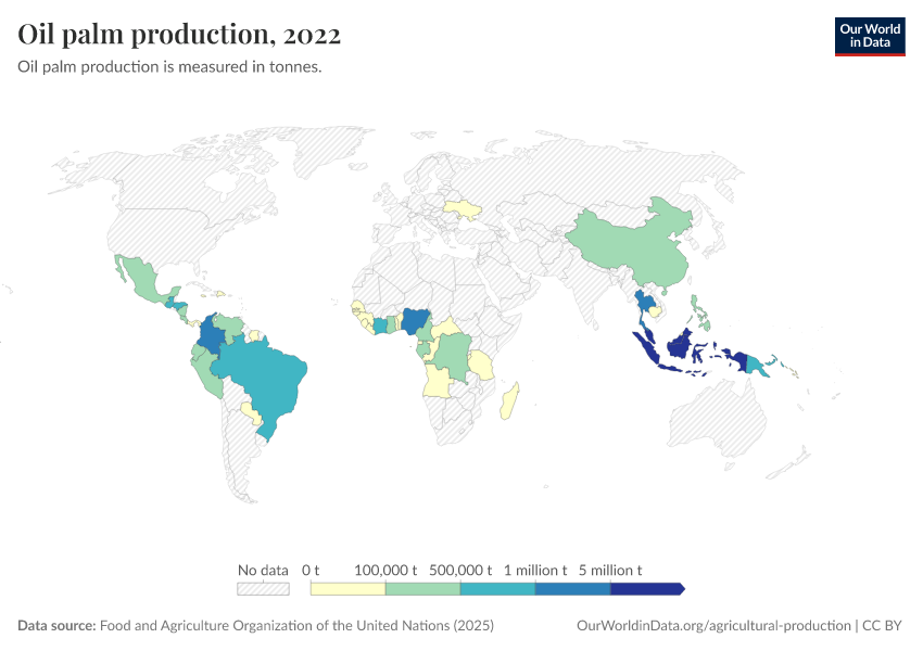 Oil palm is a tropical plant species. It thrives on high rainfall, adequate sunlight, and humid conditions – this means the best growing areas are around the equator.4 Palm oil is therefore grown in many countries across Africa, South America, and Southeast Asia. In the map, we see the distribution of production across the world.