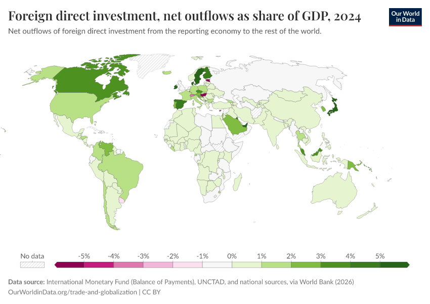 Data for this indicator is shown in the interactive visualization as foreign direct investment outflows and inflows as a share of GDP.