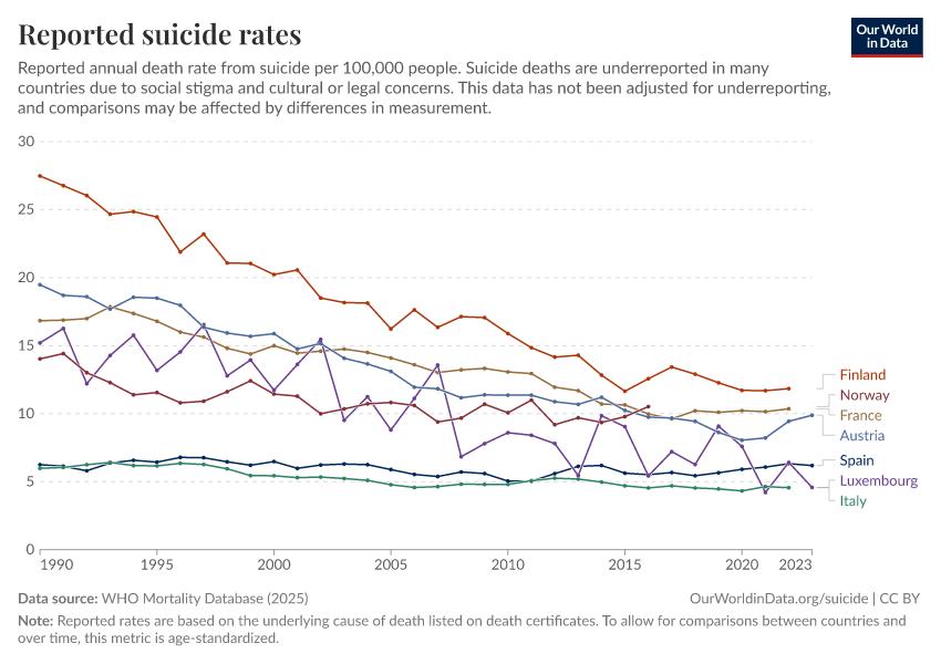 Saloni Dattani, Lucas Rodés-Guirao, Hannah Ritchie, Max Roser, and Esteban Ortiz-Ospina (2023) - “Suicides” Published online at OurWorldinData.org. Retrieved from: 'https://pop-growth-BCE.owid.pages.dev/suicide' [Online Resource]BibTeX citation