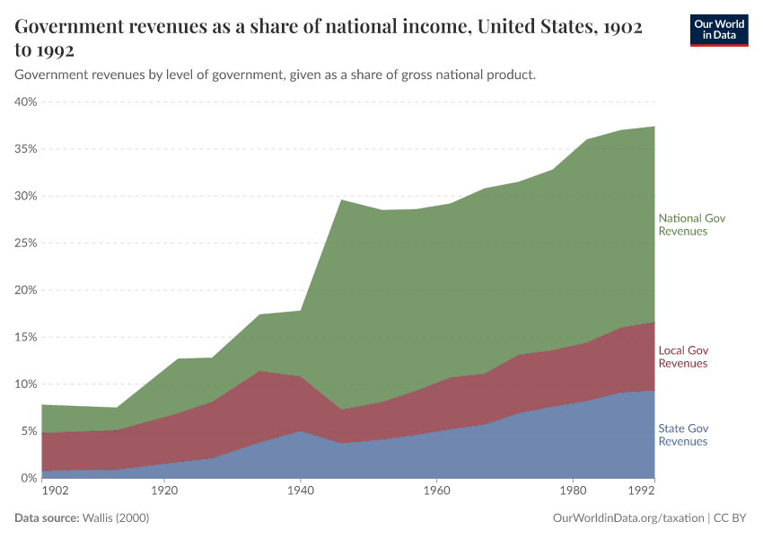 As can be seen in the chart, the implementation of new forms of taxation during the 20th century in the US was associated with underlying changes in the structure of the government. By displaying relative values in ‘Settings’, you can see how the share of national revenues rose sharply after the Second World War. This is when income tax revenues started expanding.