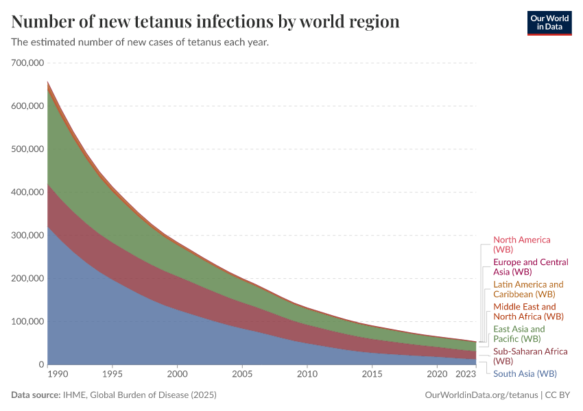 As the chart shows, these two regions account for the majority of all tetanus cases globally. Similarly, the majority of all deaths from tetanus, occur in South Asia and Sub-Saharan Africa.