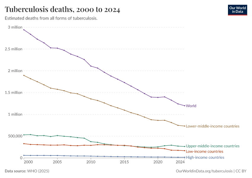 The world has made progress in reducing the burden of TB since then. In 2000, around 2.6 million people were still dying from tuberculosis each year. That has more than halved to 1.3 million. You can see this in the chart below.