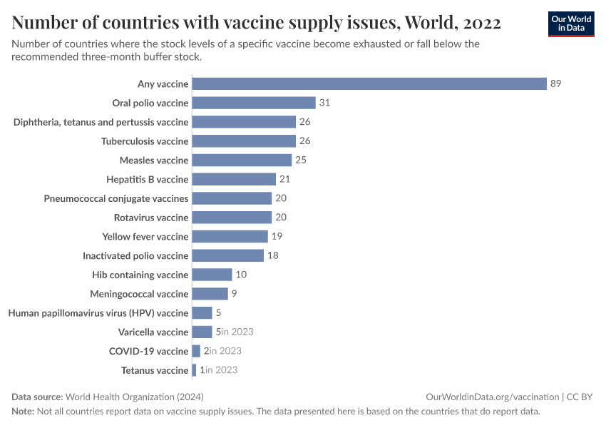 The chart shows that around 90 countries reported shortages of at least one vaccine in 2022. The most common were oral polio, DTP, and BCG vaccines — critical for preventing polio and tuberculosis. Even vaccines for diseases like rotavirus (the most common cause of death from diarrheal disease) and pneumococcal disease faced shortages, though to a lesser extent.