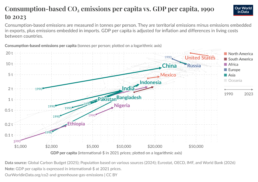 By default, the chart shows the change of income and emissions for the countries that are home to more than 100 million people, but you can add other countries to the chart.
